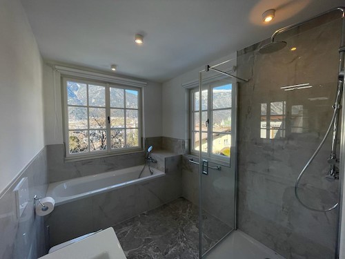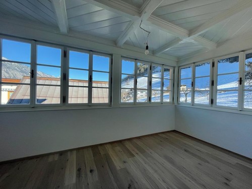 Die Fassade wurden mit den ursprünglichen Strukaturen versehen und ab dem ersten Obergeschoss mit Lärchenholz verschalt. Der südseitige Balkon wurde ebenfalls originalgetreu nachgebaut. Auf der Talseite des Gebäudes wurden drei Terrassenbalkone angebracht, welche sich trotz der modernen Stahlbauweise harmonisch in die Gesamtoptik des Gebäudes eingliedern.