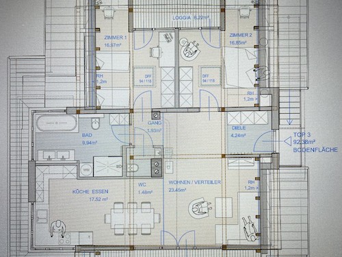 Das Penthouse, mit seinen bis unter das Dach reichenden, hohen Räumen besticht durch eine atemberaubende Sicht auf die darunter liegende Stadt.